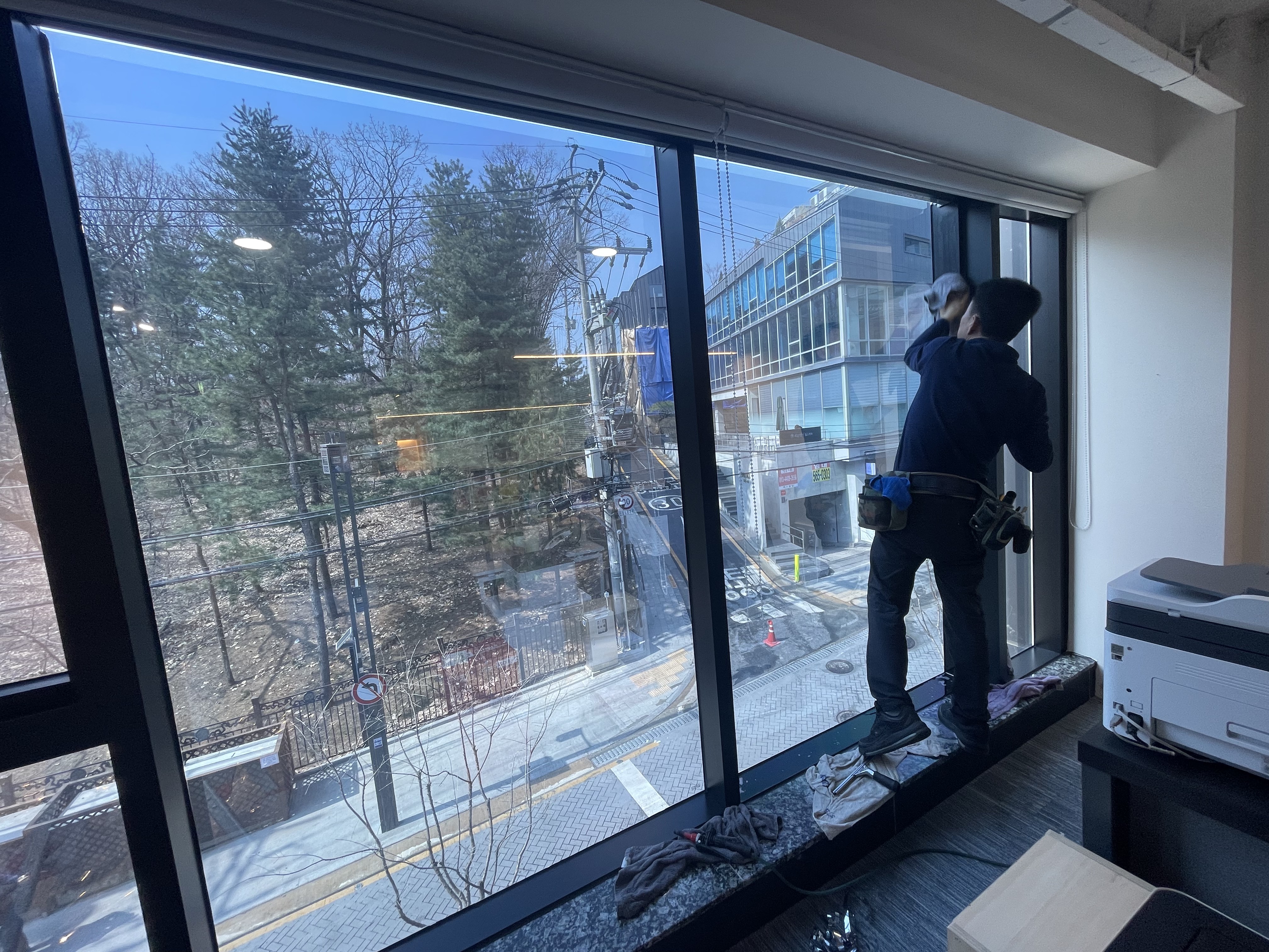 유리창 썬팅지 코팅은 미세한 먼지나 기포 하나 없이 유리에 완벽하게 밀착시켜야 하는 고난도의 정밀한 작업입니다. 이번 강남 사무실 현장은 프리미엄 커튼 블라인드 및 필름 시공 업계에서 10년 이상 일해온 전문가의 시공으로 꼼꼼하게 진행되었습니다.