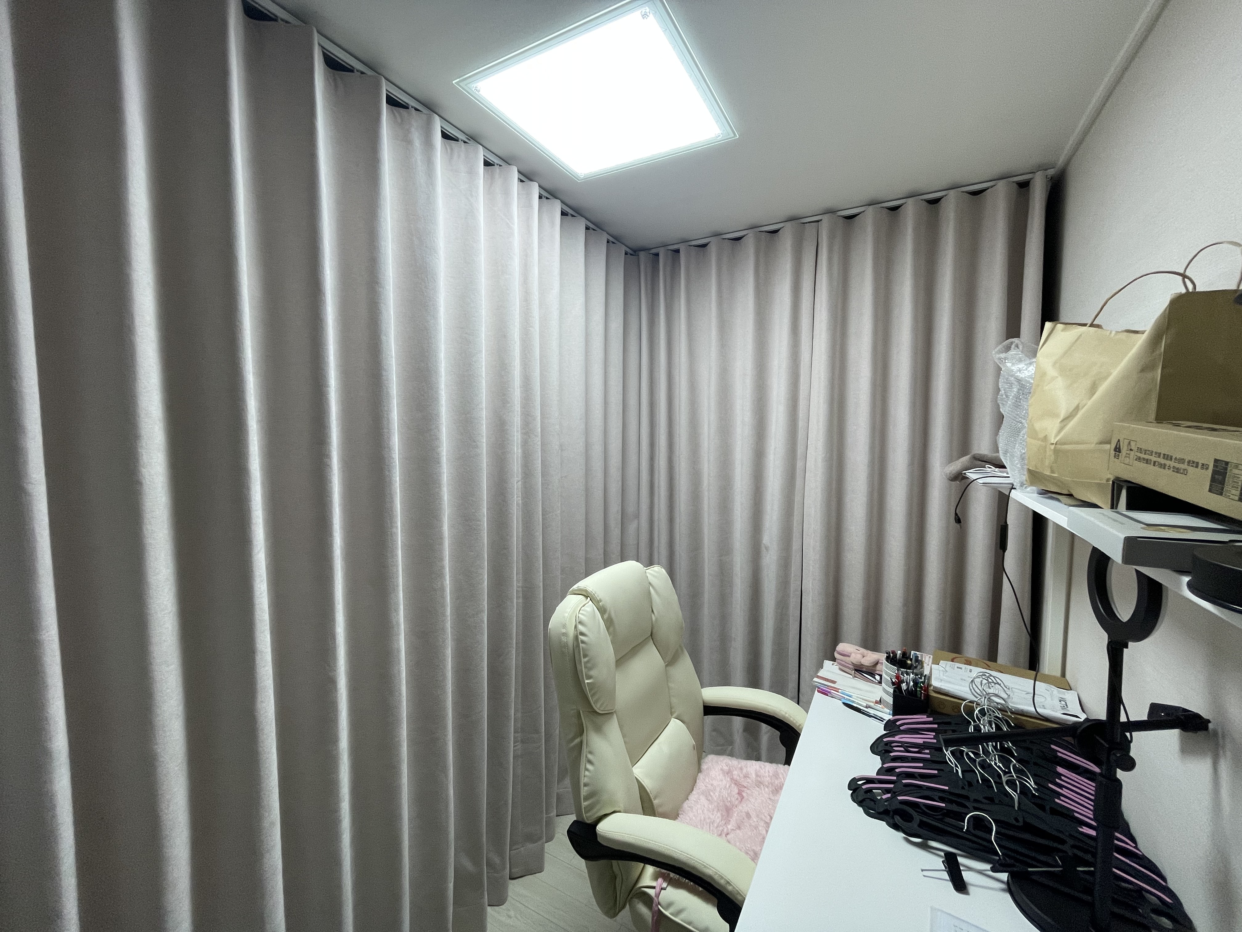 관악구에서 활동하시는 크리에이터 및 스튜디오 운영자 여러분, 방송의 퀄리티를 결정짓는 핵심은 무엇일까요? 바로 '조명'과 '배경'입니다. 아무리 좋은 장비를 써도 자연광이 제멋대로 들어오거나 뒷배경이 지저분하면 화면이 산만해 보이기 십상인데요. 오늘은 빛을 완벽하게 차단하여 조명 효율을 높이고, 동시에 화면에 뽀샤시하게 담기는 '베이비핑크 암막커튼'을 배경으로 설치하여 스튜디오의 분위기를 확 바꾼 시공 사례를 소개해 드립니다.