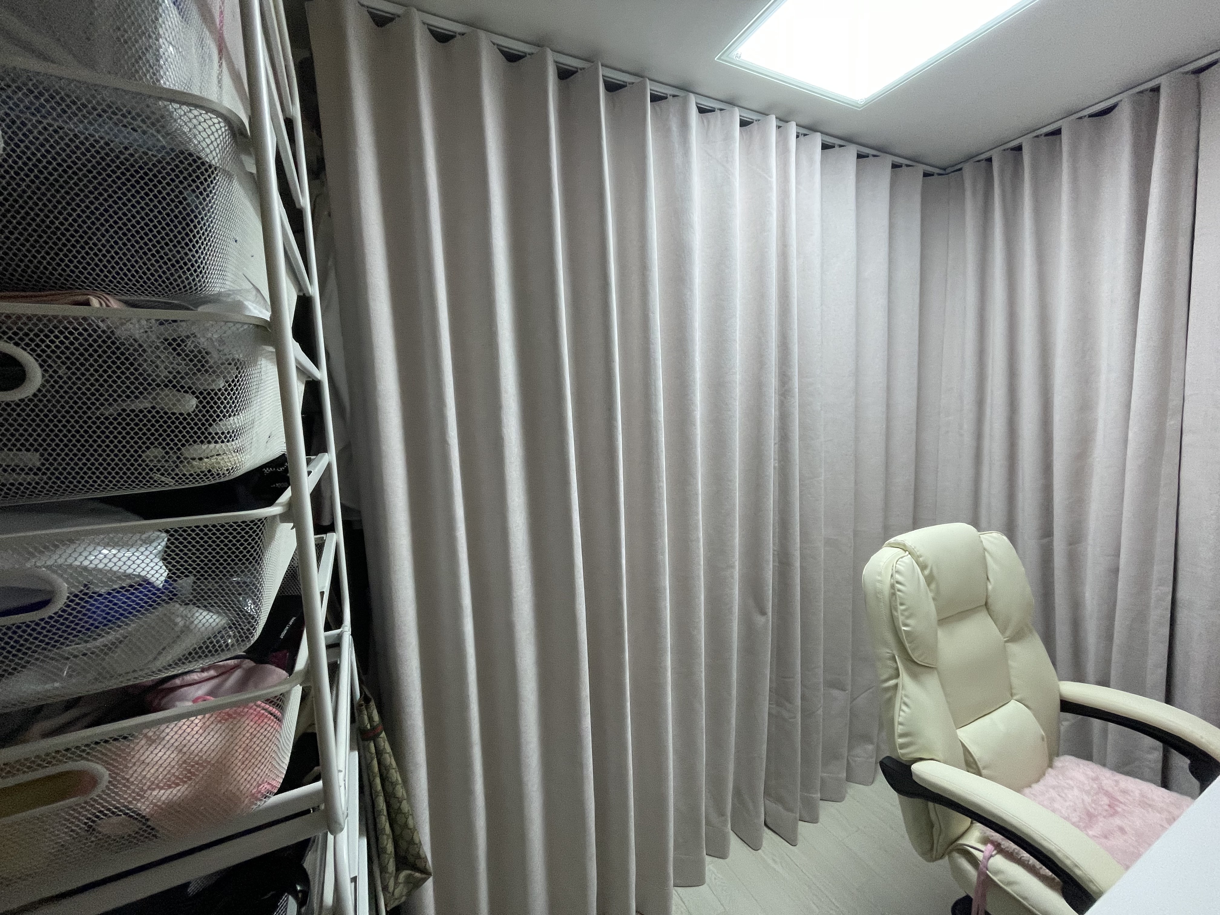 스튜디오 천장에는 조명 레일, 흡음재, 각종 배선이 복잡하게 얽혀 있어 커튼 설치가 일반 가정집보다 훨씬 까다롭습니다. 이번 시공은 프리미엄 커튼·블라인드 업계에서 10년 이상 경험을 쌓은 전문가가 직접 방문하여 진행했습니다.
