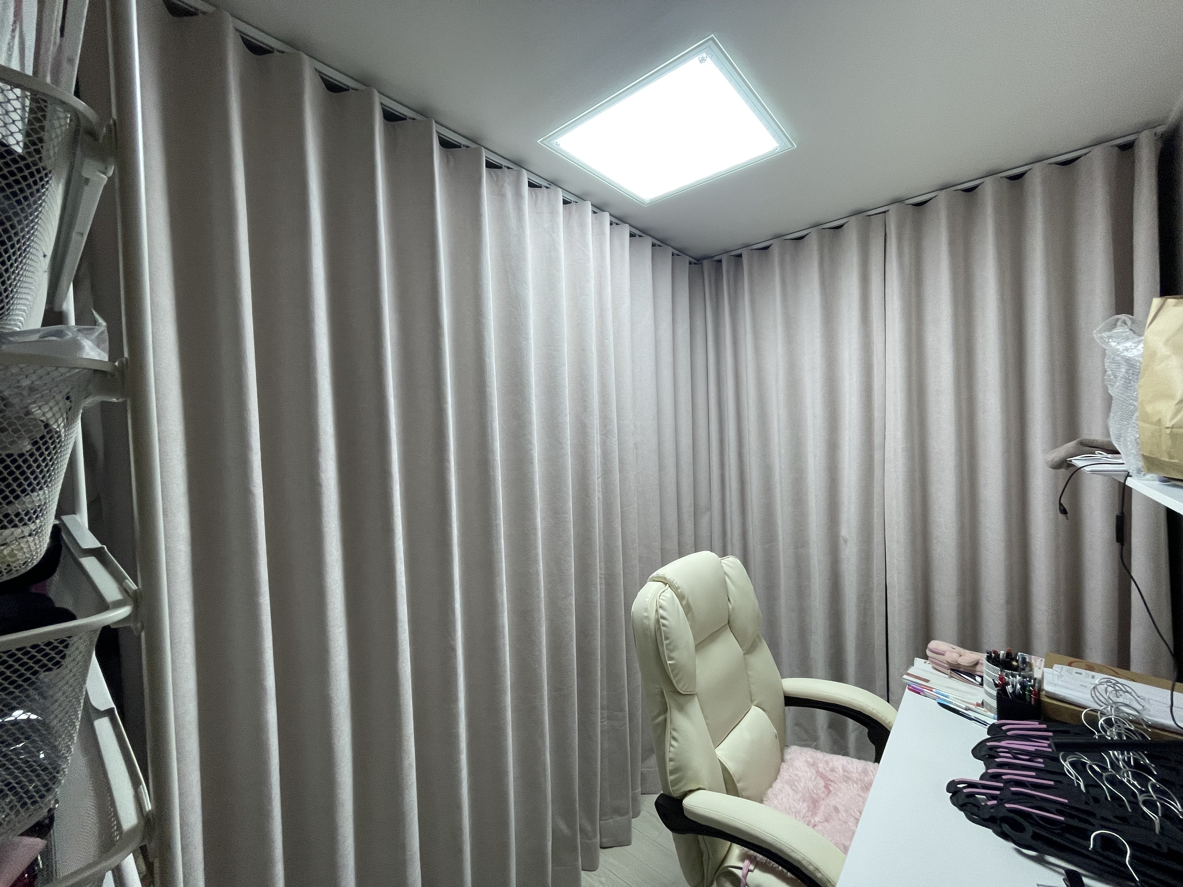 스튜디오 천장에는 조명 레일, 흡음재, 각종 배선이 복잡하게 얽혀 있어 커튼 설치가 일반 가정집보다 훨씬 까다롭습니다. 이번 시공은 프리미엄 커튼·블라인드 업계에서 10년 이상 경험을 쌓은 전문가가 직접 방문하여 진행했습니다.