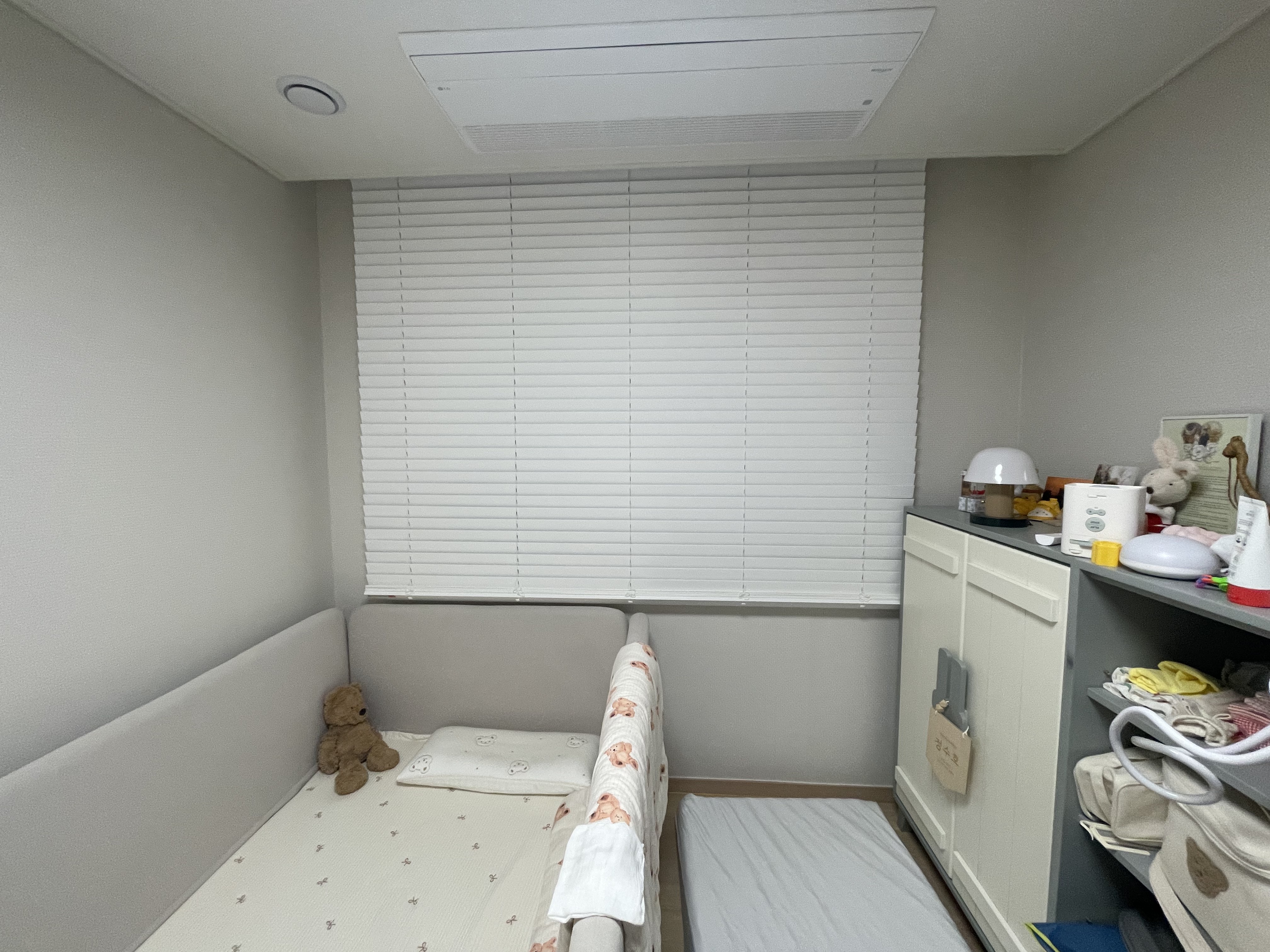 자녀방에도 먼지 쌓인 블라인드 대신 '기능이 뛰어난' 아이보리 암막 커튼을 시공했습니다. 아이들은 수면 환경에 예민하기 때문에, 빛 틈이 생기는 블라인드보다는 창문 전체를 포근하게 감싸주는 암막 커튼이 훨씬 효과적입니다.