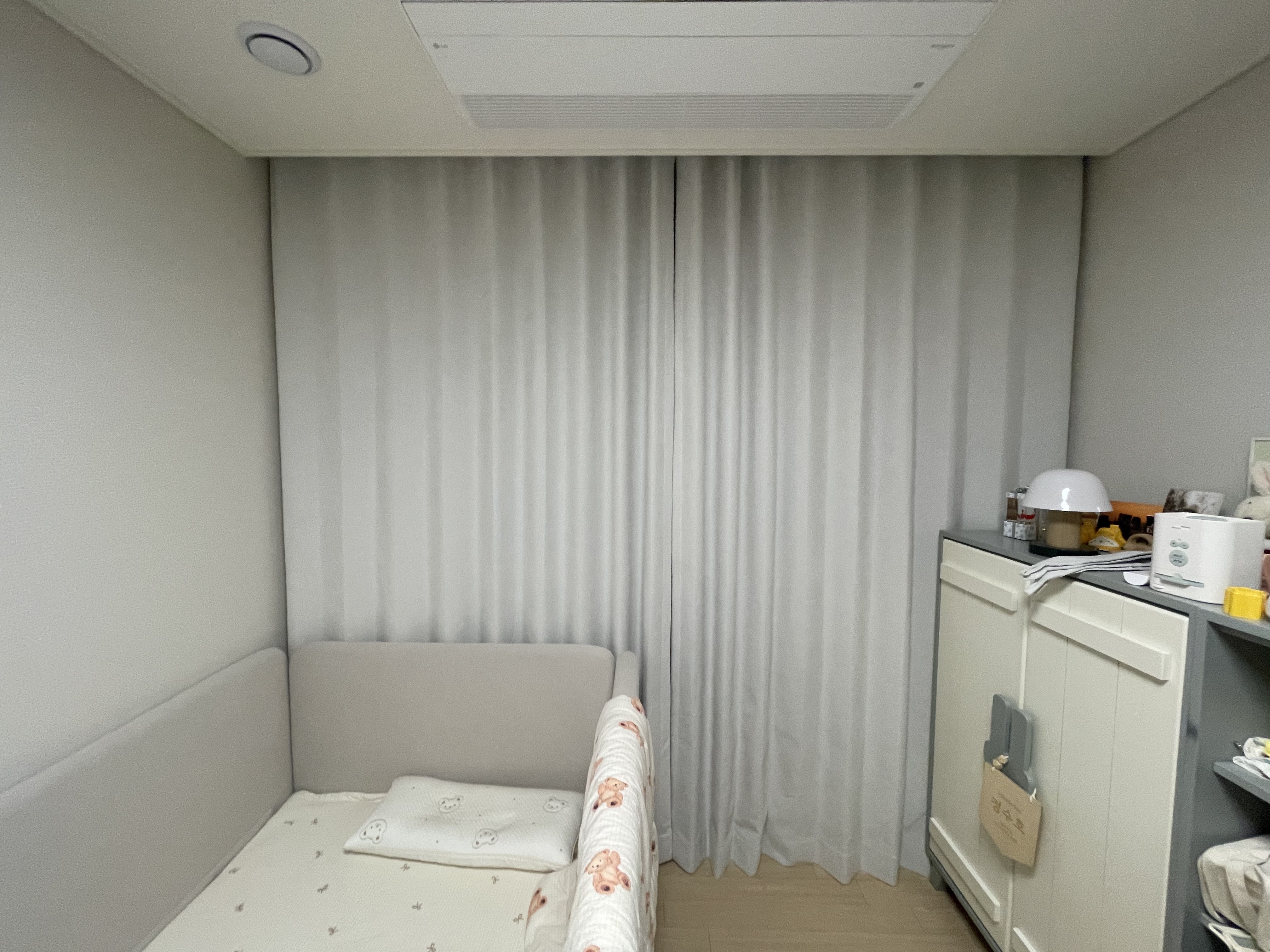 자녀방에도 먼지 쌓인 블라인드 대신 '기능이 뛰어난' 아이보리 암막 커튼을 시공했습니다. 아이들은 수면 환경에 예민하기 때문에, 빛 틈이 생기는 블라인드보다는 창문 전체를 포근하게 감싸주는 암막 커튼이 훨씬 효과적입니다.
