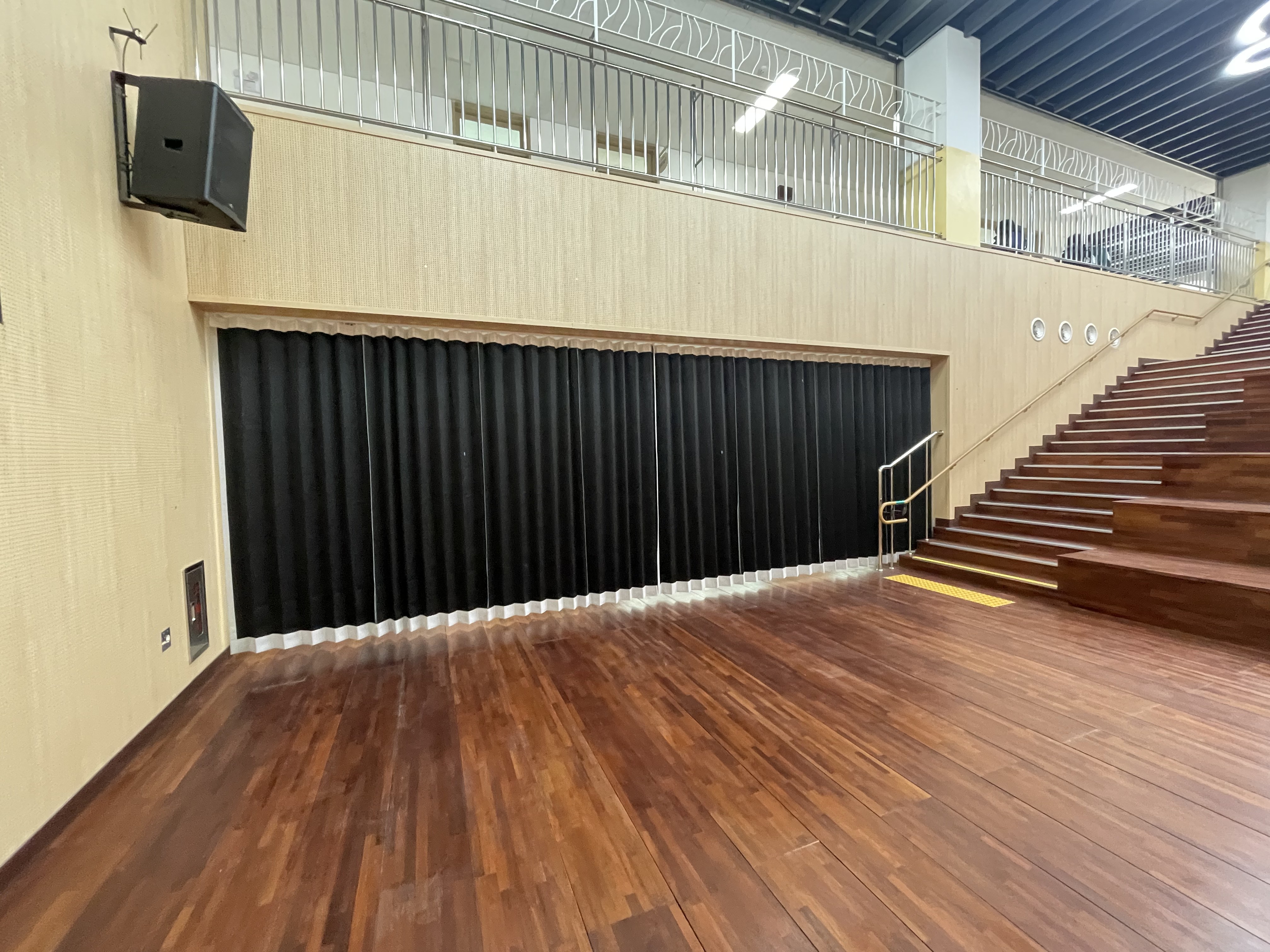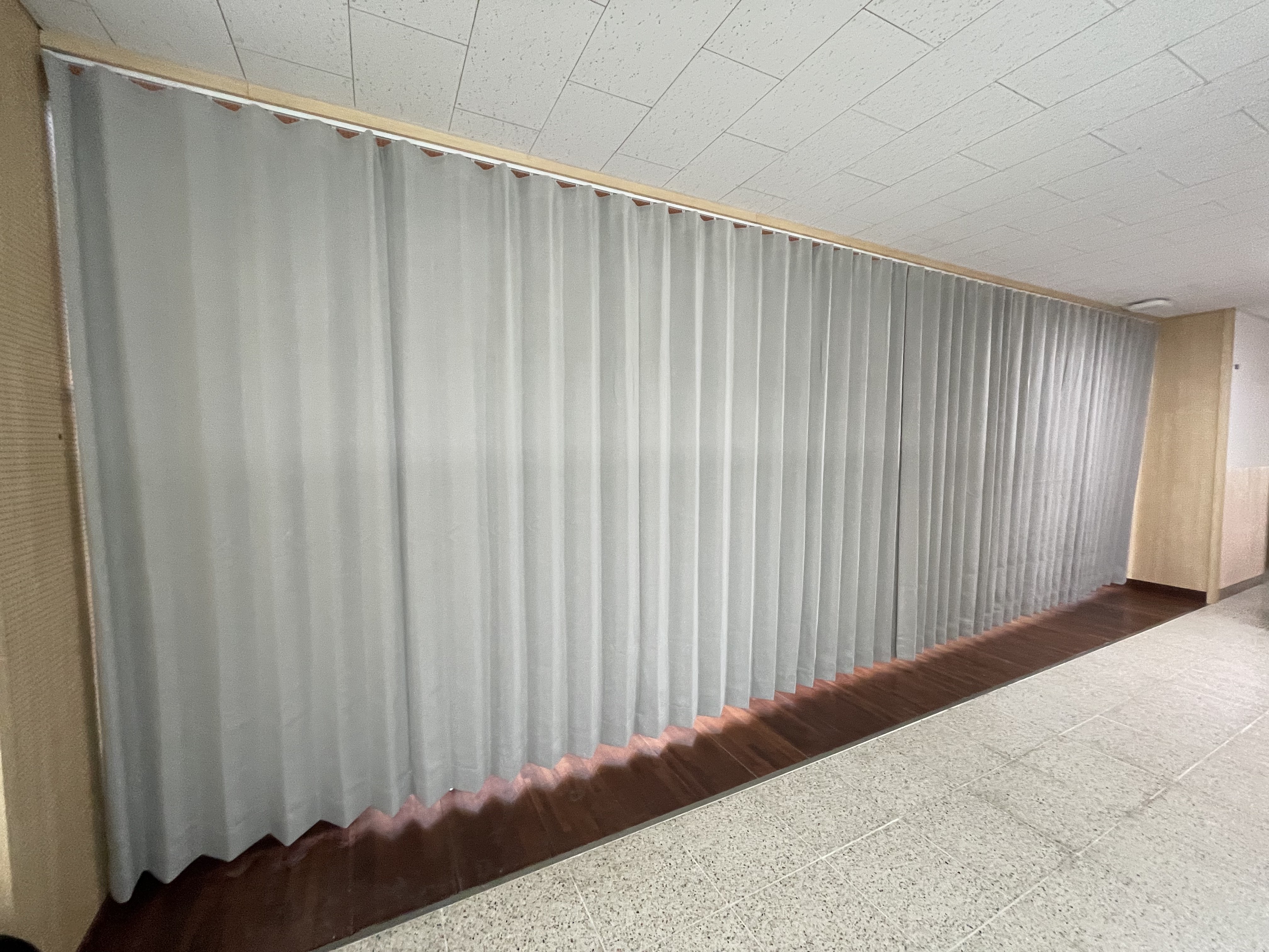 강당은 체육 활동뿐만 아니라 다양한 행사가 열리는 다목적 교육 공간입니다. 너무 무겁고 칙칙한 색상보다는 강당의 전반적인 톤 앤 매너에 맞춘 색상을 선택해 인테리어 디자인이 잘 어울리는 제품으로 시공을 진행했습니다. 넓은 강당을 용도에 따라 효율적으로 분리할 수 있는 가림막 역할을 톡톡히 해내며, 커튼을 닫아두었을 때도 깔끔하고 단정한 공간 분위기를 연출합니다.