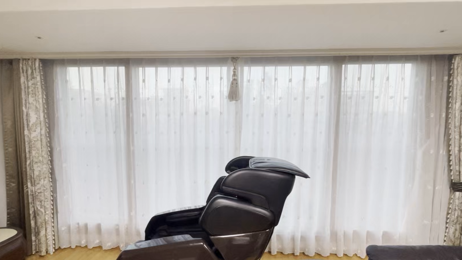 전동 기능이 뼈대라면, 디자인은 그 위에 입히는 옷입니다. 기계적인 느낌 없이 아늑하고 세련된 거실을 만들기 위해 '인테리어 디자인이 잘 어울리는' 도톰한 화이트 쉬폰, 일명 '차르르 커튼'을 매치했습니다.