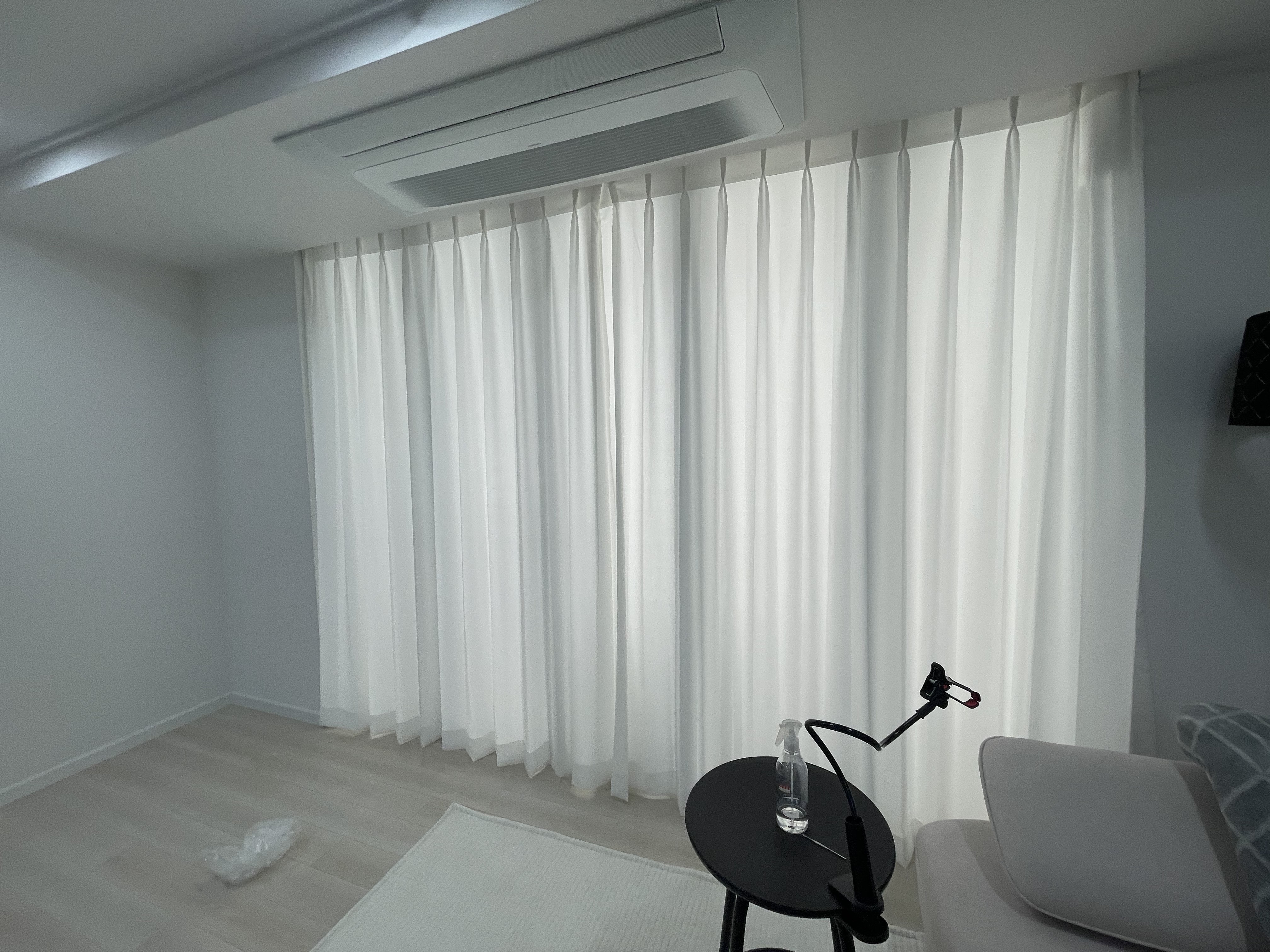 이렇게 전동 커튼, 블라인드, 일반 커튼 등 다양한 종류를 한 번에 시공할 때는 기술력이 필수입니다. 이번 시공은 프리미엄 커튼·블라인드 업계에서 10년 이상 경험을 쌓은 전문가가 직접 진행했습니다. 전동 모터의 배선 작업부터 블라인드 수평 조절, 커튼의 주름 핏까지 완벽하게 잡아내어 안전하고 튼튼하게 마감했습니다.