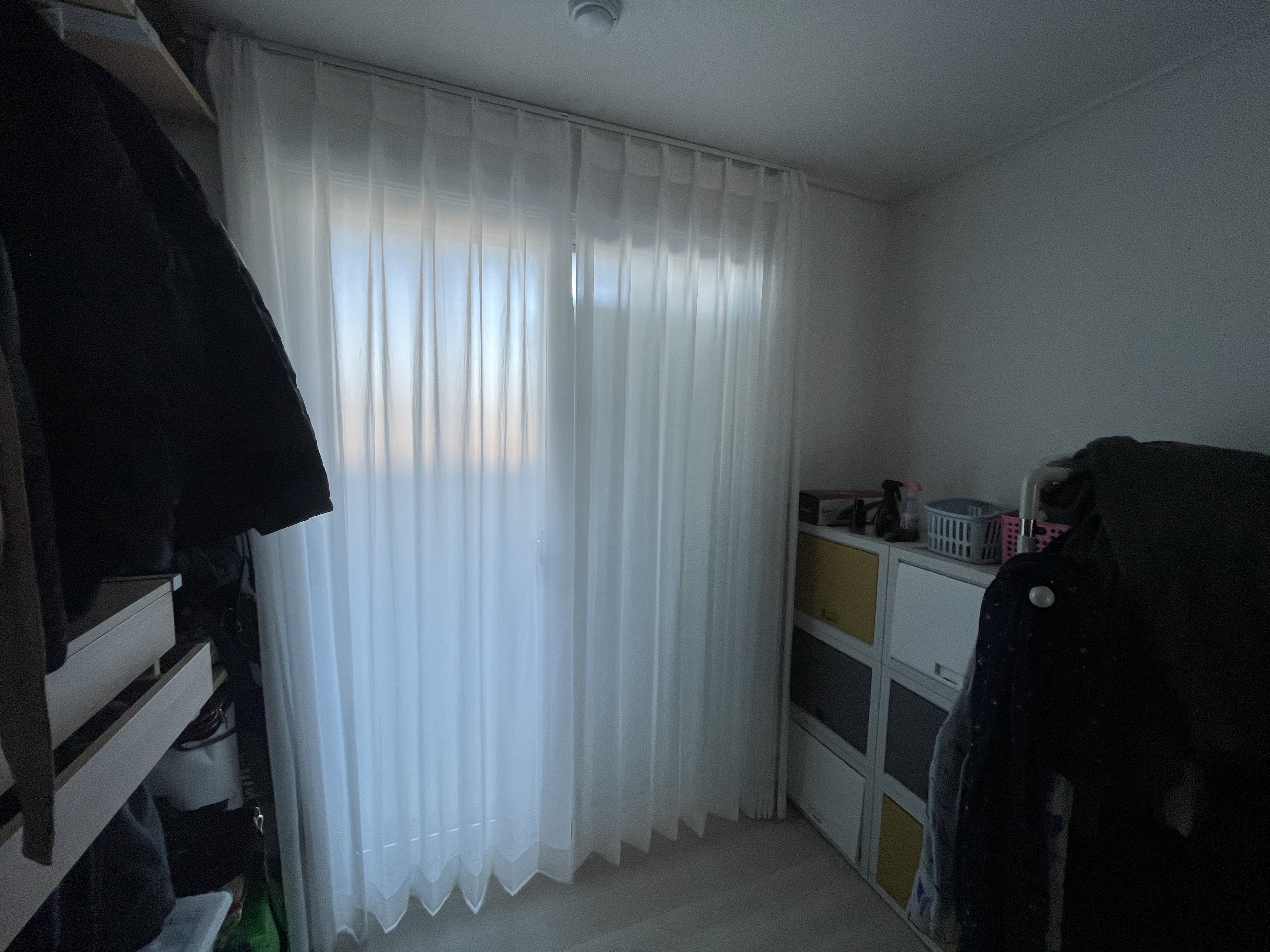 반면, 잡동사니를 보관하는 창고방에는 '암막커튼'을 시공했습니다. 지저분한 선반이나 짐들을 깔끔하게 가려주는 가림막 역할을 하면서, 직사광선을 완벽하게 차단하여 보관 물품이 손상되지 않도록 보호하는 기능적인 선택이었습니다.