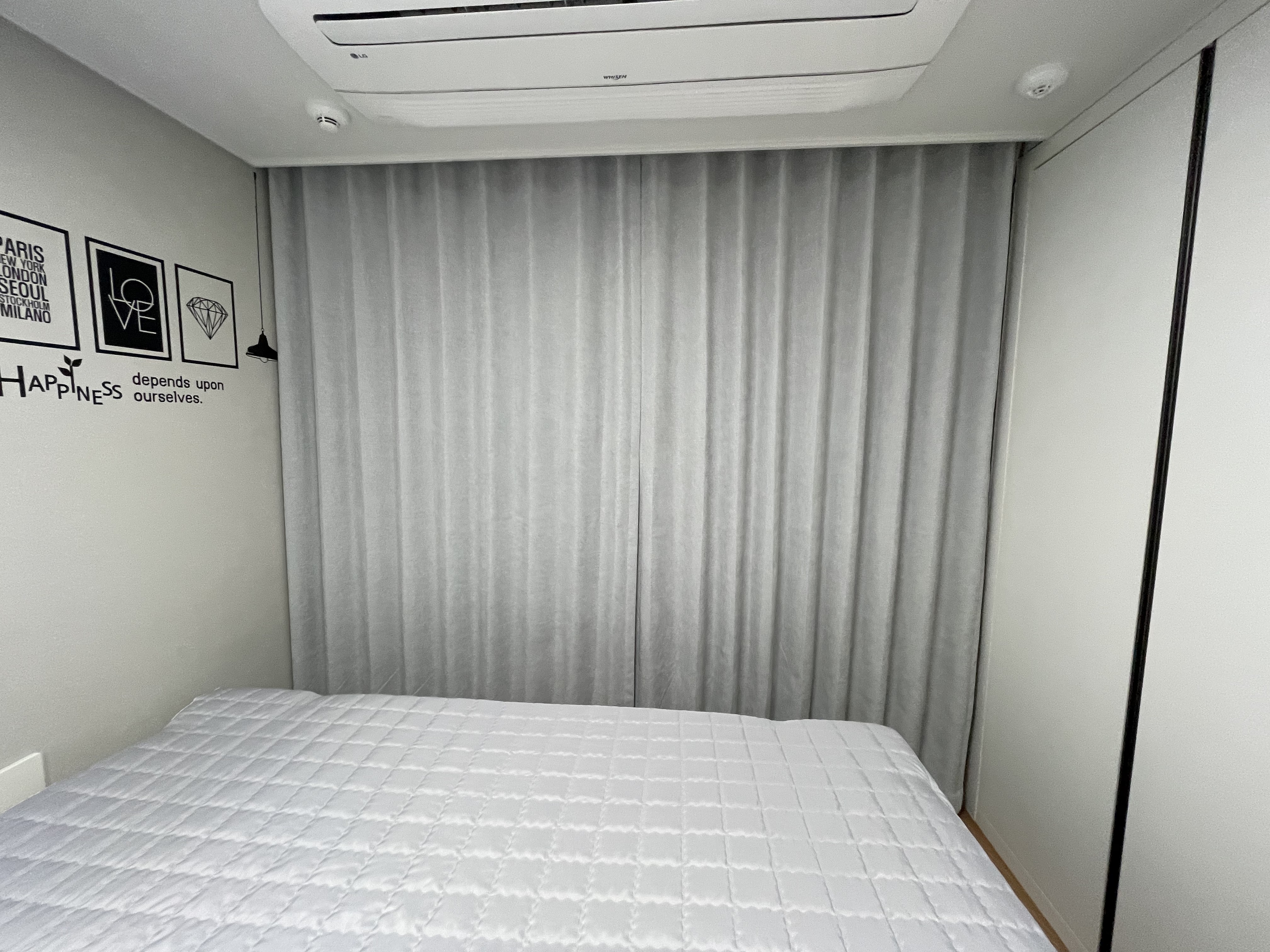 이곳에 설치된 암막커튼은 '기능이 뛰어난 제품'으로, 원단 자체의 빛 차단율이 매우 우수합니다. 아침의 눈부심을 완벽히 막아주어 깊은 숙면을 돕고, 여름철과 겨울철 외부의 열기와 냉기를 차단해 주어 냉난방 효율까지 높여주는 똑똑하고 실용적인 아이템입니다.