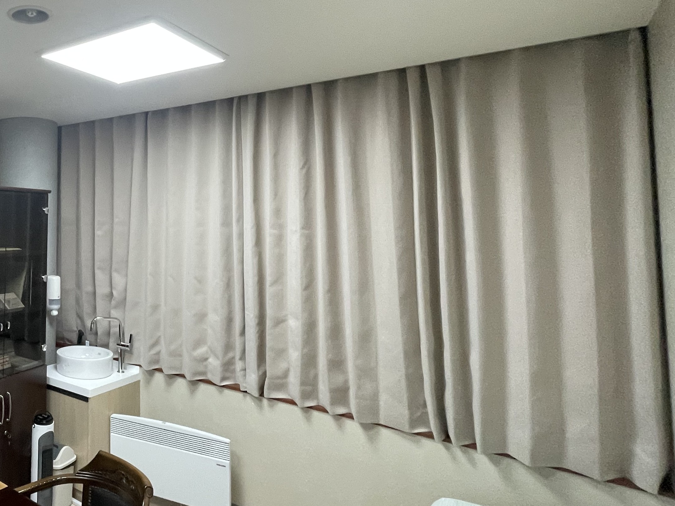 진료실의 차가운 느낌을 없애기 위해 '인테리어 디자인이 잘 어울리는' 따뜻한 컬러 조합을 제안해 드렸습니다. 메인 창에는 포근한 아이보리 암막 커튼을 설치하여 안정감을 주고, 프라이버시가 필요한 곳에는 카키그린 콤비블라인드를 매치했습니다.