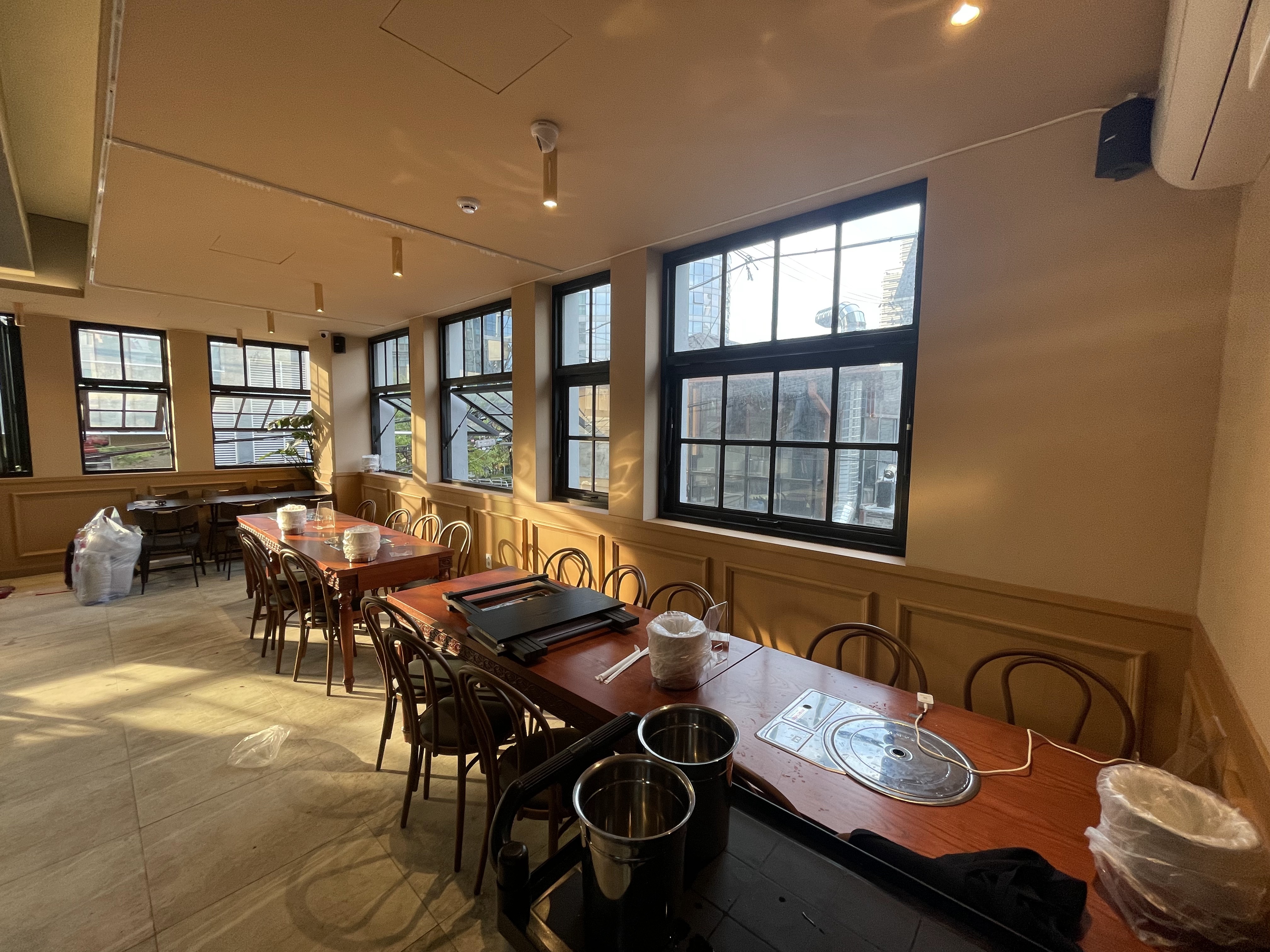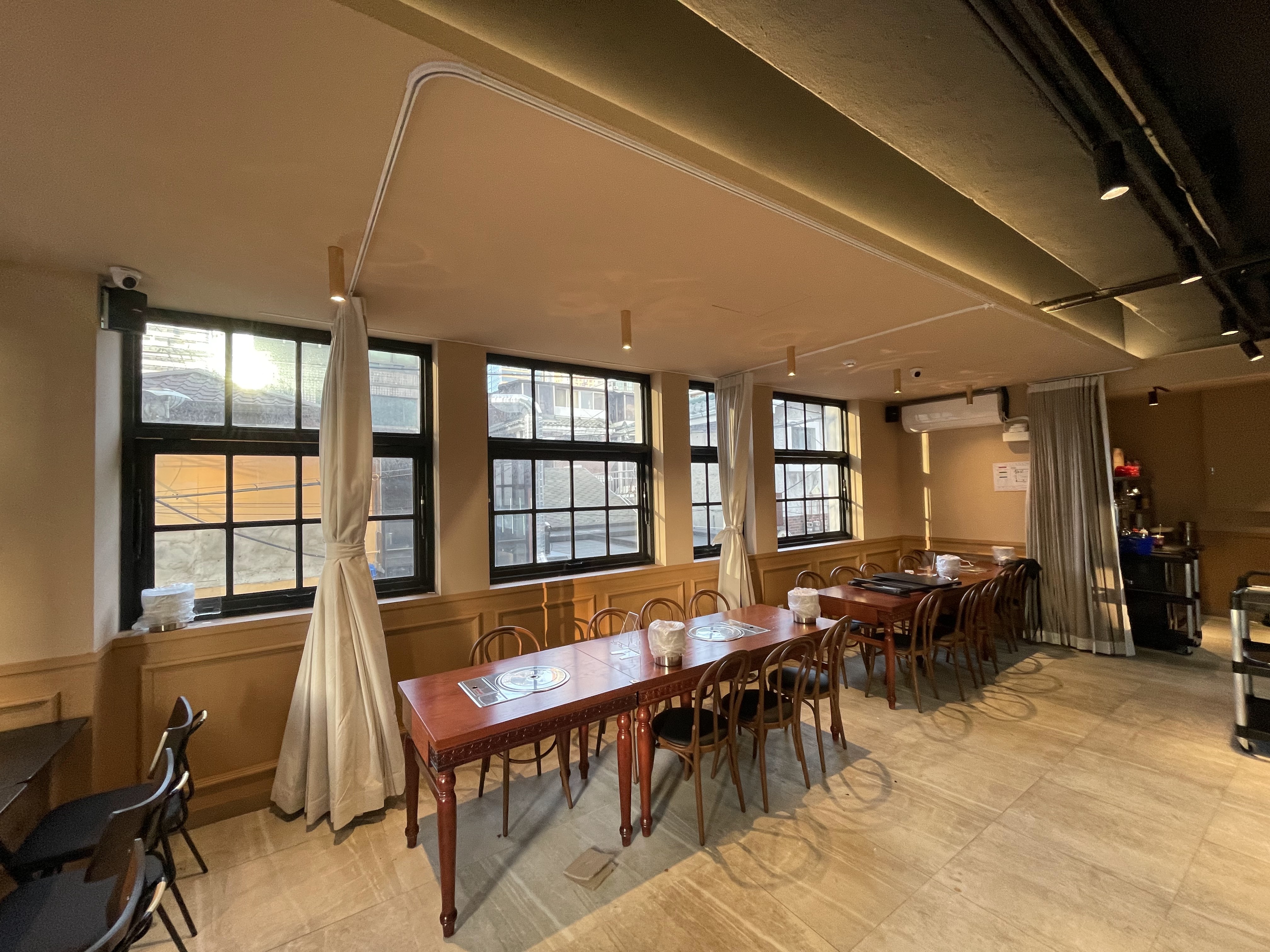 음식점 천장은 배관이나 조명 레일, 시스템 에어컨 등으로 인해 구조가 복잡한 경우가 많습니다. 일반 가정집보다 시공 난이도가 높기에 경험 많은 전문가의 손길이 필수적입니다. 이번 현장은 프리미엄 커튼·블라인드 업계에서 10년 이상 경험을 쌓은 전문가가 직접 시공을 담당했습니다.