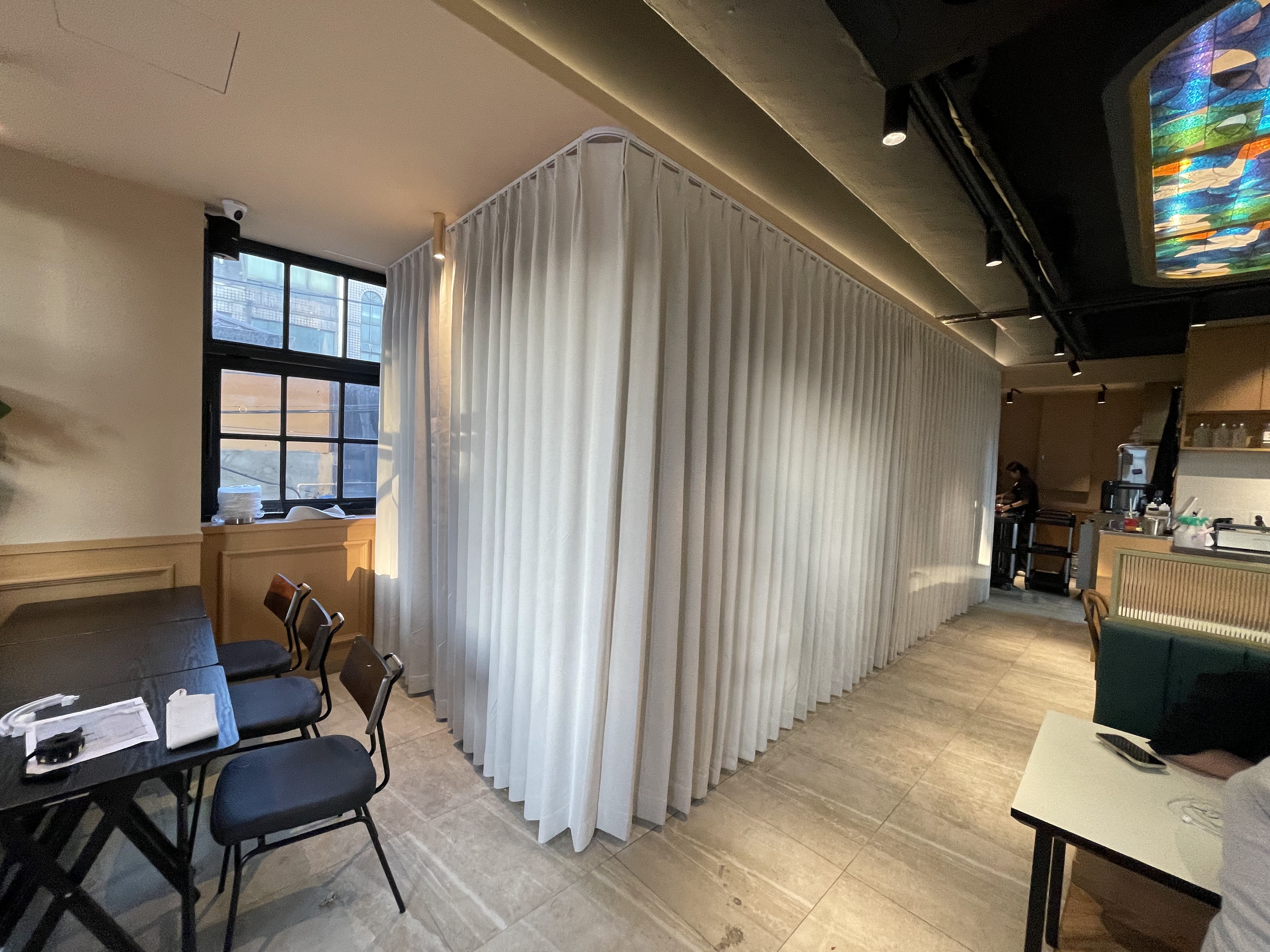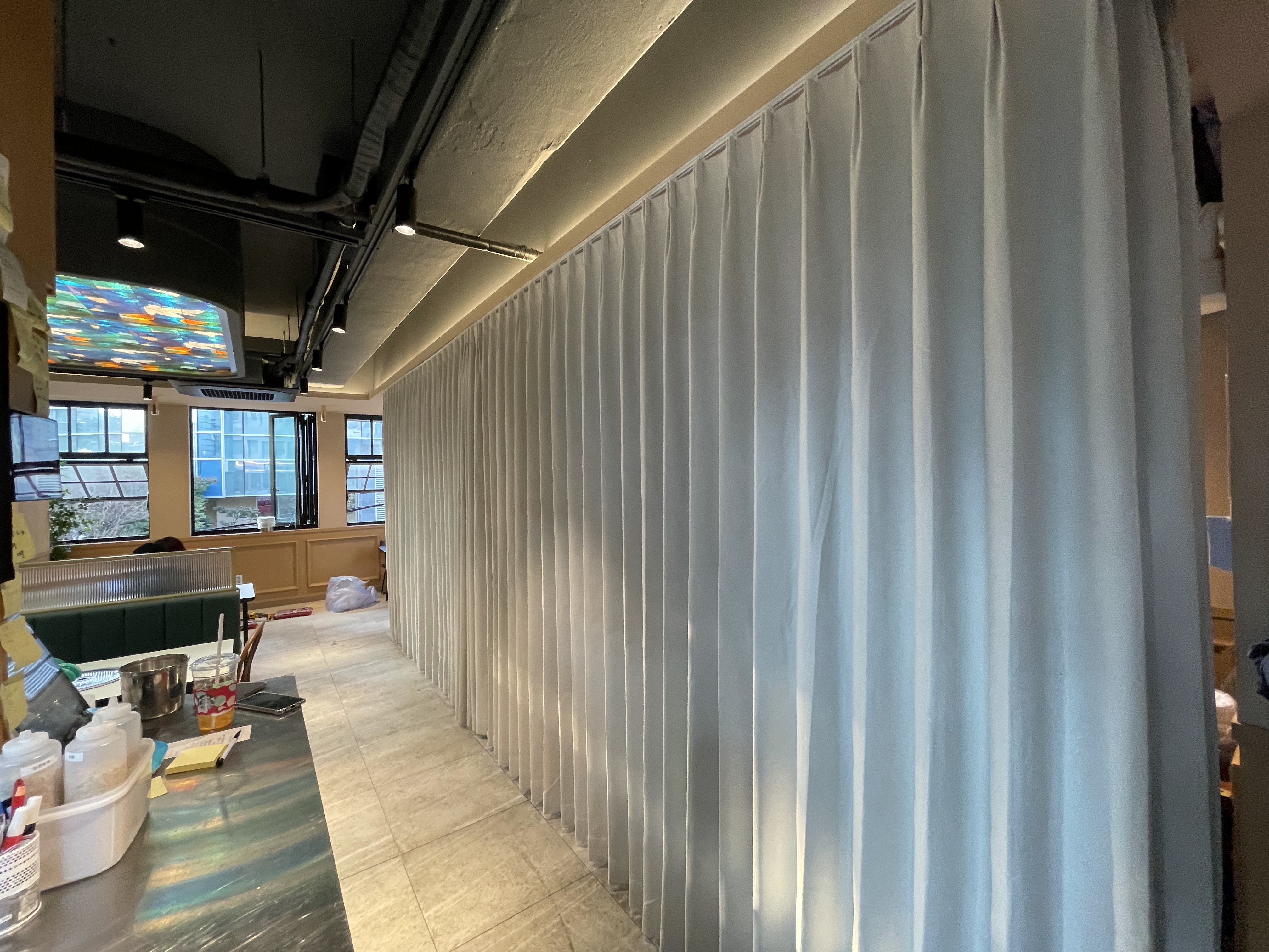 파티션 용도로 사용하는 커튼은 비침이 없어야 합니다. 얇은 원단은 사람의 실루엣이 비쳐 프라이버시 보호라는 본래의 목적을 달성하기 어렵기 때문입니다. 이번 시공에는 '기능이 뛰어난' 고밀도 암막 원단이 사용되었습니다.