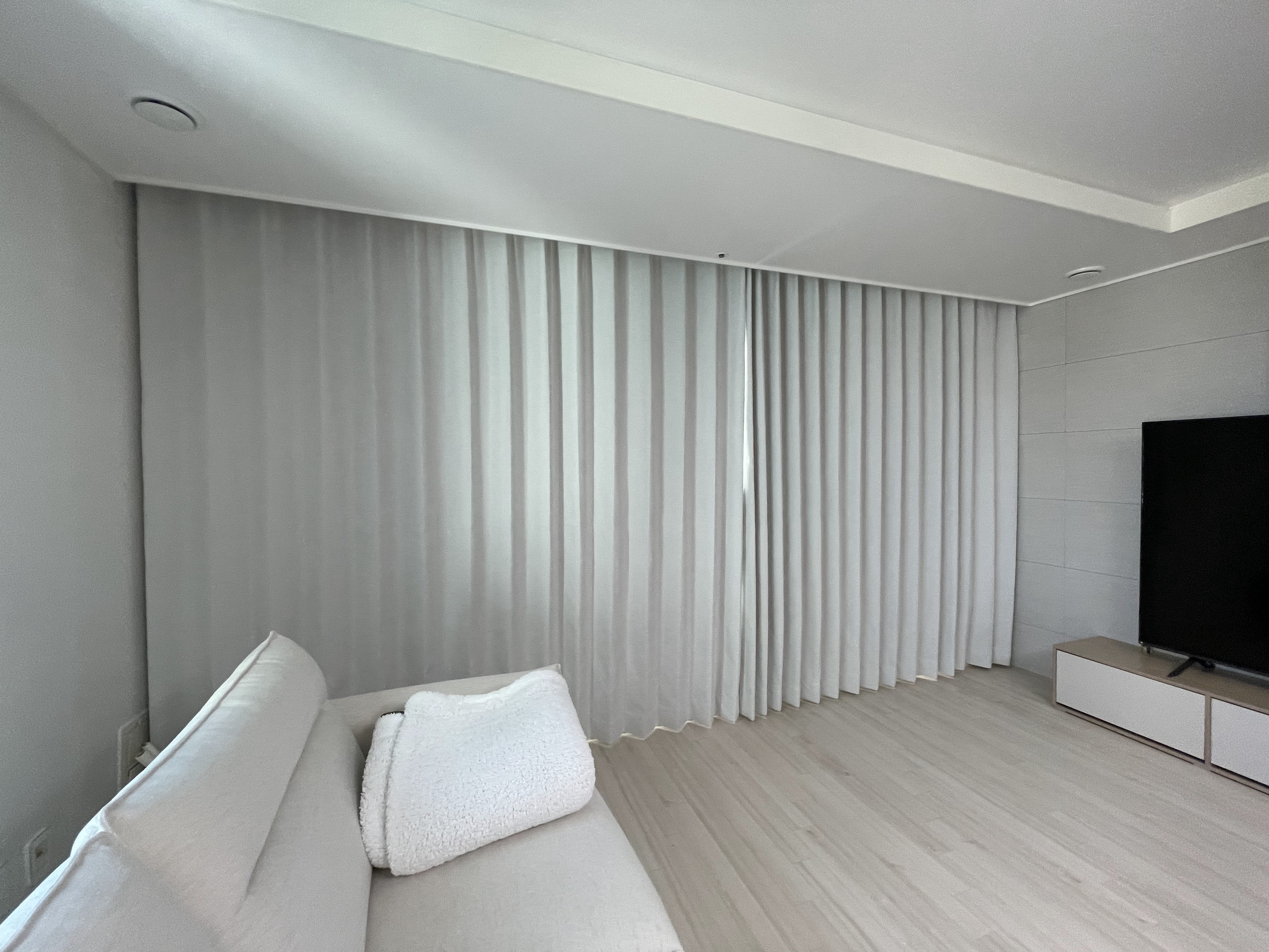 커튼의 완성도는 '주름'과 '길이'에서 결정됩니다. 특히 아이보리 같은 밝은 계열은 바닥에 끌리거나 주름이 엉성하면 지저분해 보이기 쉽습니다. 이번 현장은 프리미엄 커튼·블라인드 업계에서 10년 이상 경험을 쌓은 전문가가 직접 실측하고 시공했습니다.