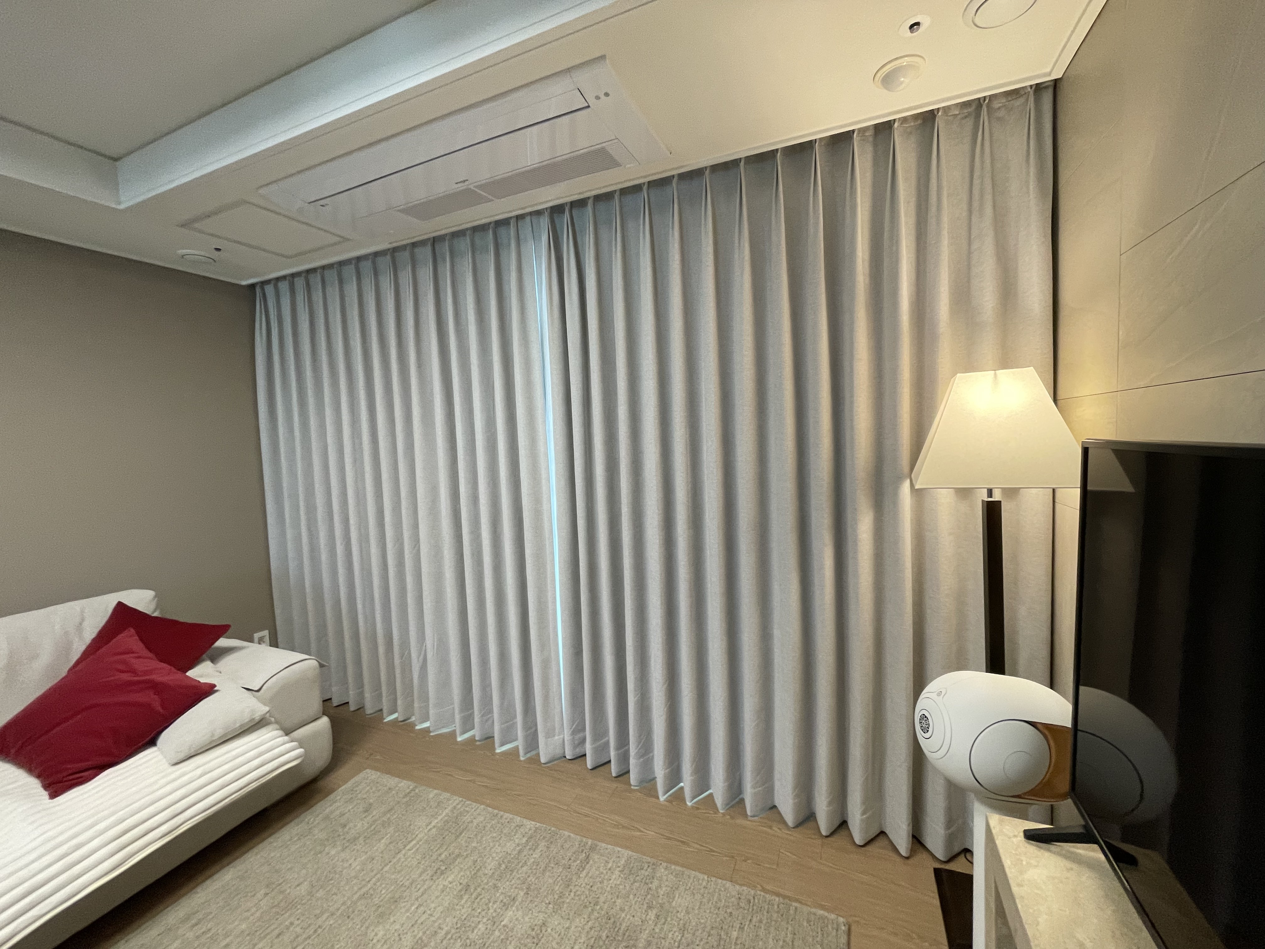 이중 커튼은 레일이 두 줄로 들어가고 원단의 무게가 상당하기 때문에 설치 난이도가 높습니다. 자칫 잘못 설치하면 레일이 처지거나 커튼끼리 간섭이 생겨 여닫기 불편해질 수 있습니다. 이번 시공은 프리미엄 커튼·블라인드 업계에서 10년 이상 경험을 쌓은 전문가가 직접 진행했습니다.