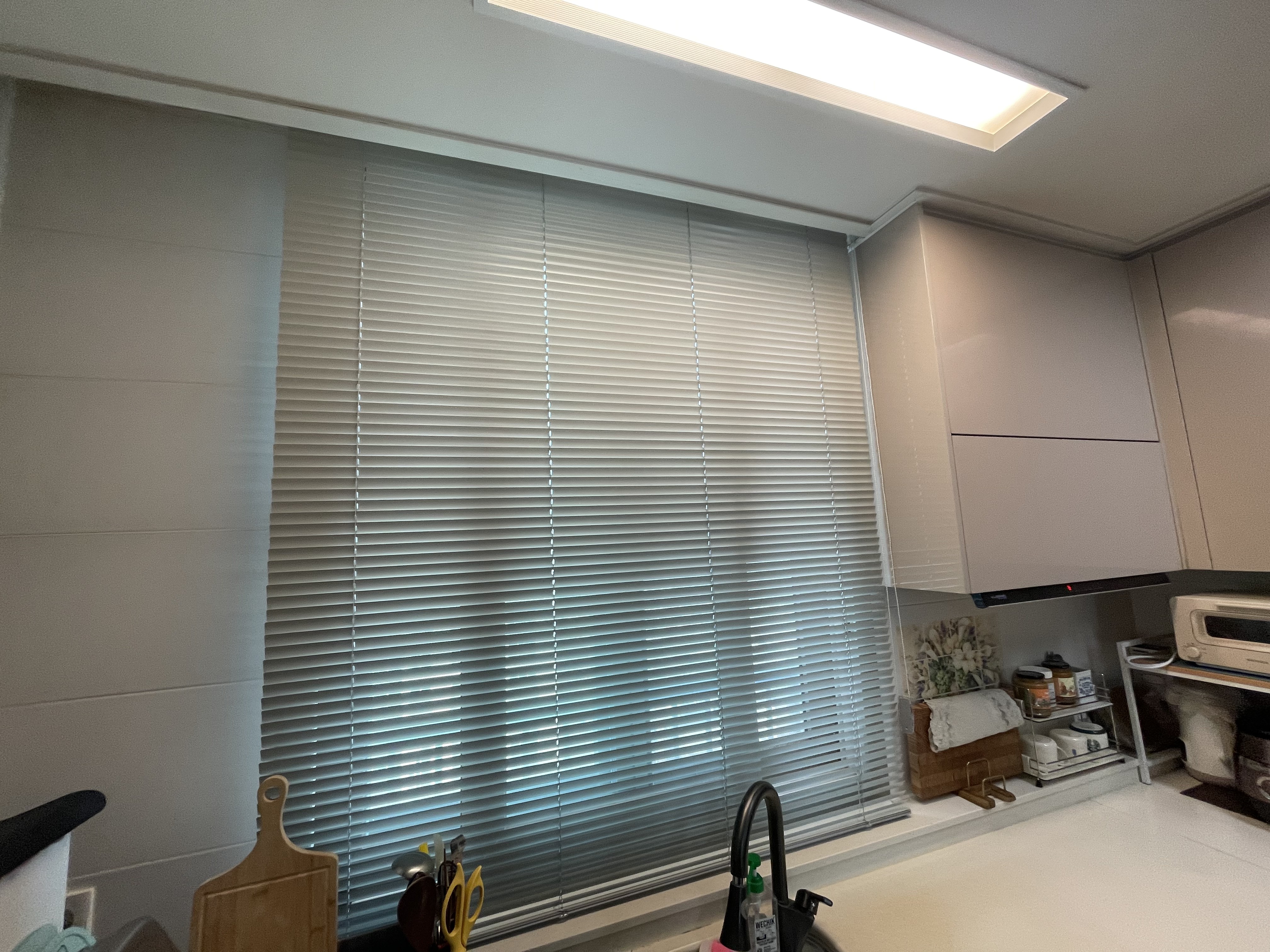 물의 사용이 잦은 주방과 분위기가 중요한 서재(작은방)에는 각기 다른 소재를 적용했습니다. 주방에는 습기에 강하고 관리가 편한 '라이트그레이 알루미늄 블라인드'를 설치해 모던하고 위생적인 환경을 만들었습니다.