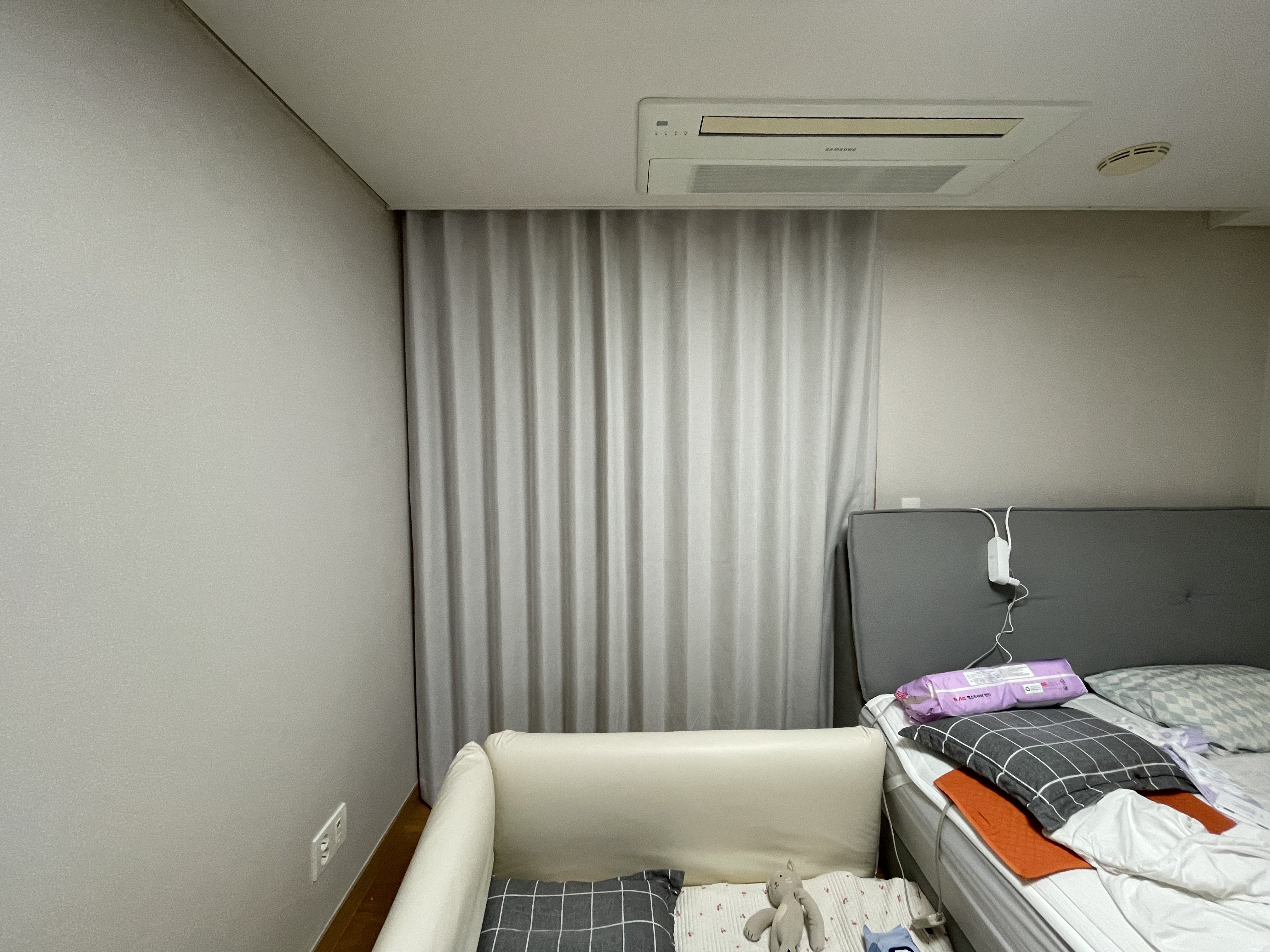 하루의 피로를 푸는 안방에는 '기능이 뛰어난' 고밀도 암막 커튼을 선택했습니다. 수면에 방해가 되는 아침의 강렬한 햇살과 야간의 외부 조명을 확실하게 막아주어 최상의 휴식 환경을 제공합니다.