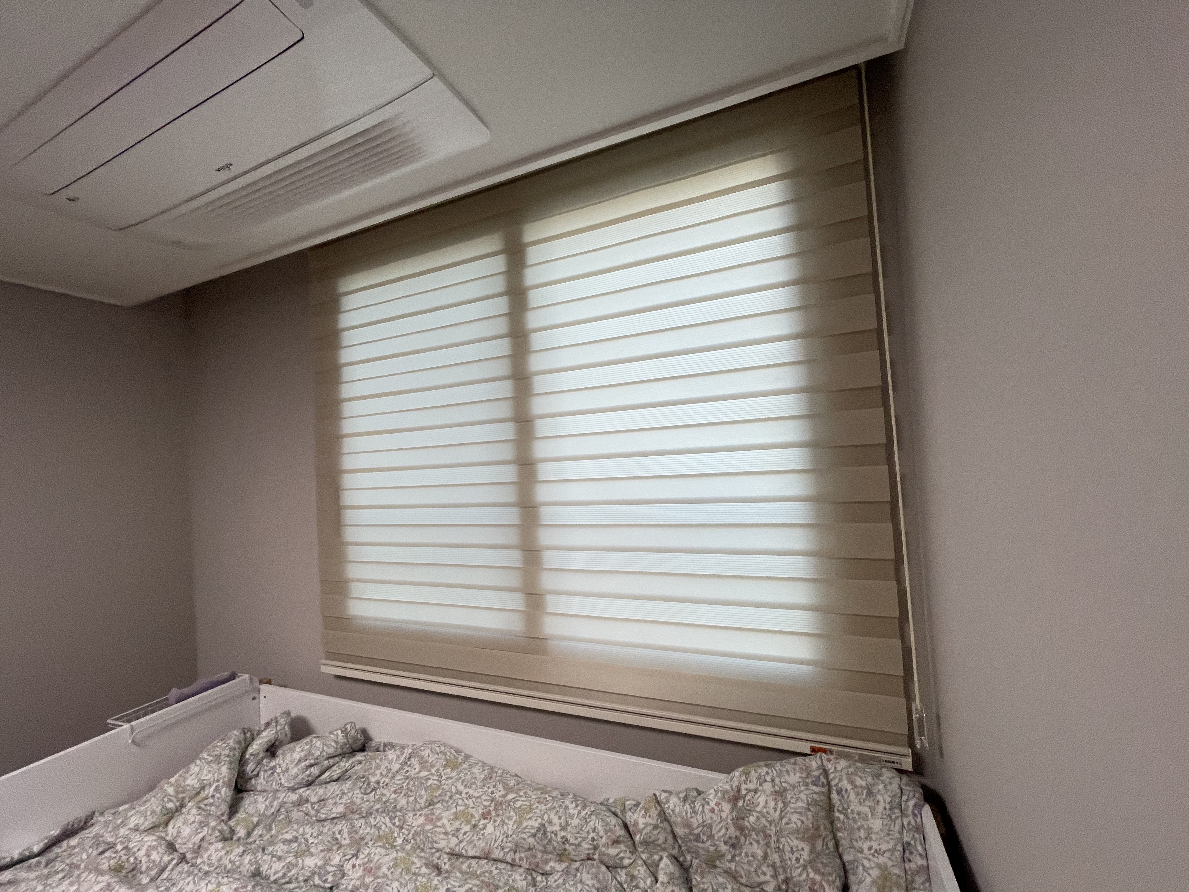 작은방 1에는 따뜻하고 포근한 느낌을 주는 '베이지'를, 작은방 2에는 안방과 통일감을 주는 시크한 '라이트그레이'를 매치했습니다. 콤비블라인드는 손잡이 하나로 채광과 통풍을 자유롭게 조절할 수 있어 관리가 매우 편리하며, 합리적인 비용으로 각 방의 개성을 살릴 수 있는 스마트한 방법입니다.