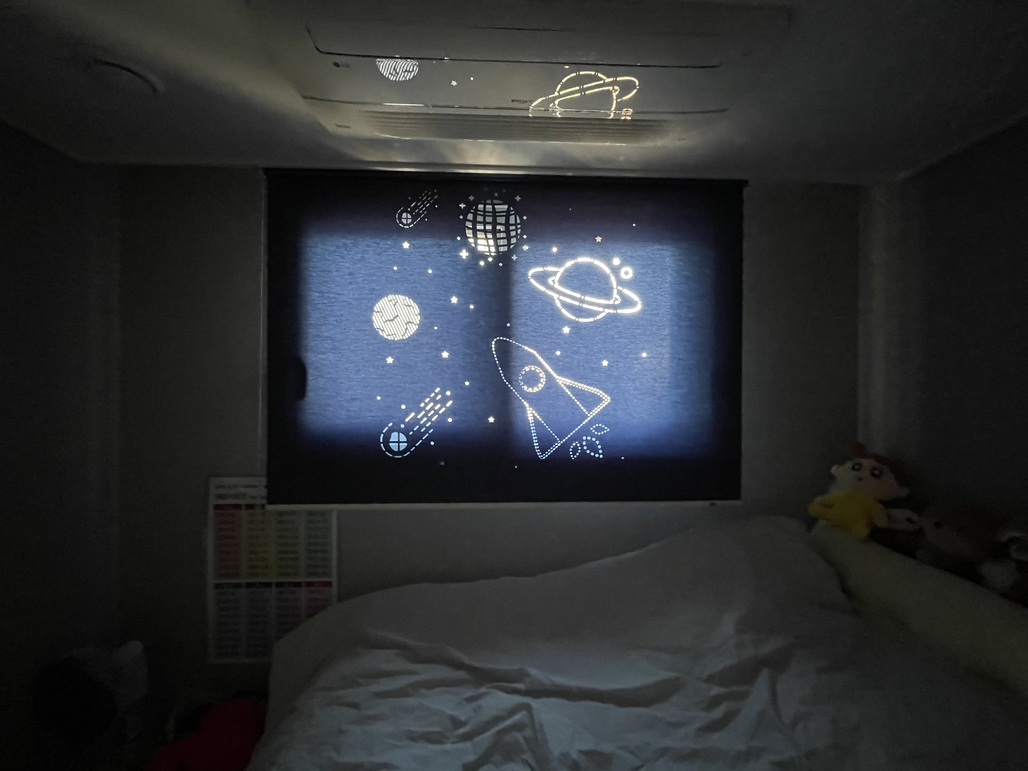 안방에는 공간을 좁고 답답하게 만들지 않는 밝은 '아이보리 암막커튼'을 시공하여 아침 햇살을 부드럽게 차단하는 포근한 수면 환경을 조성했습니다. 반면 아이방에는 빛을 효과적으로 차단함과 동시에 타공된 패턴 사이로 빛이 들어오는 '네이비 레이저롤스크린 블라인드'를 설치했습니다. 마치 밤하늘의 별빛이 쏟아지는 듯한 감성적인 포인트로 아이가 머물고 싶어 하는 특별한 공간을 완성했습니다.