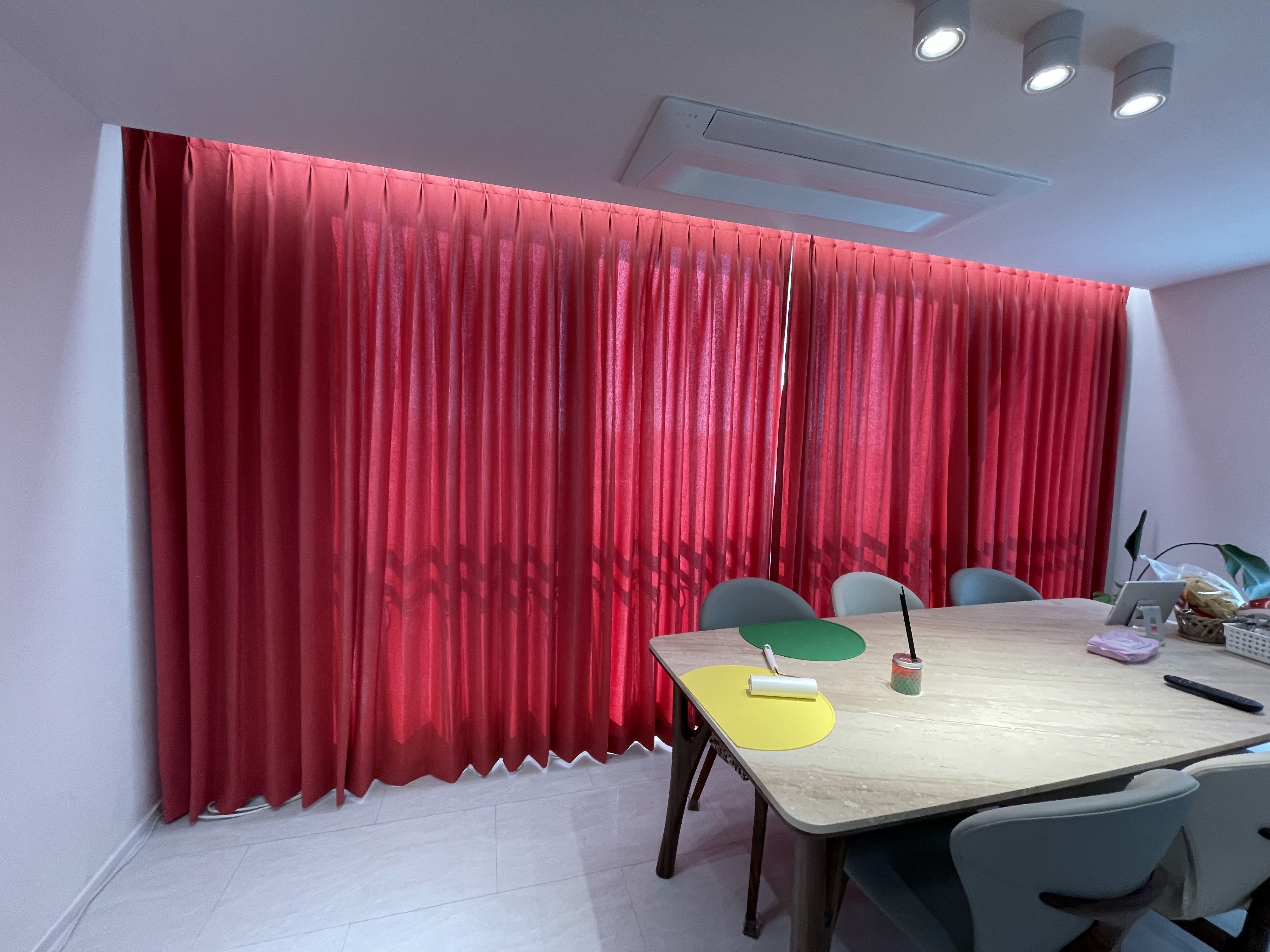 천장 커튼 박스의 폭을 정밀하게 계산하여 레일을 설치하고, 레드 커튼의 형상 기억 가공을 통해 주름이 칼같이 떨어지도록 세팅했습니다. 전문가 자격증이 증명하는 노하우로, 사용의 편리함과 시각적인 완성도를 모두 잡았습니다.
