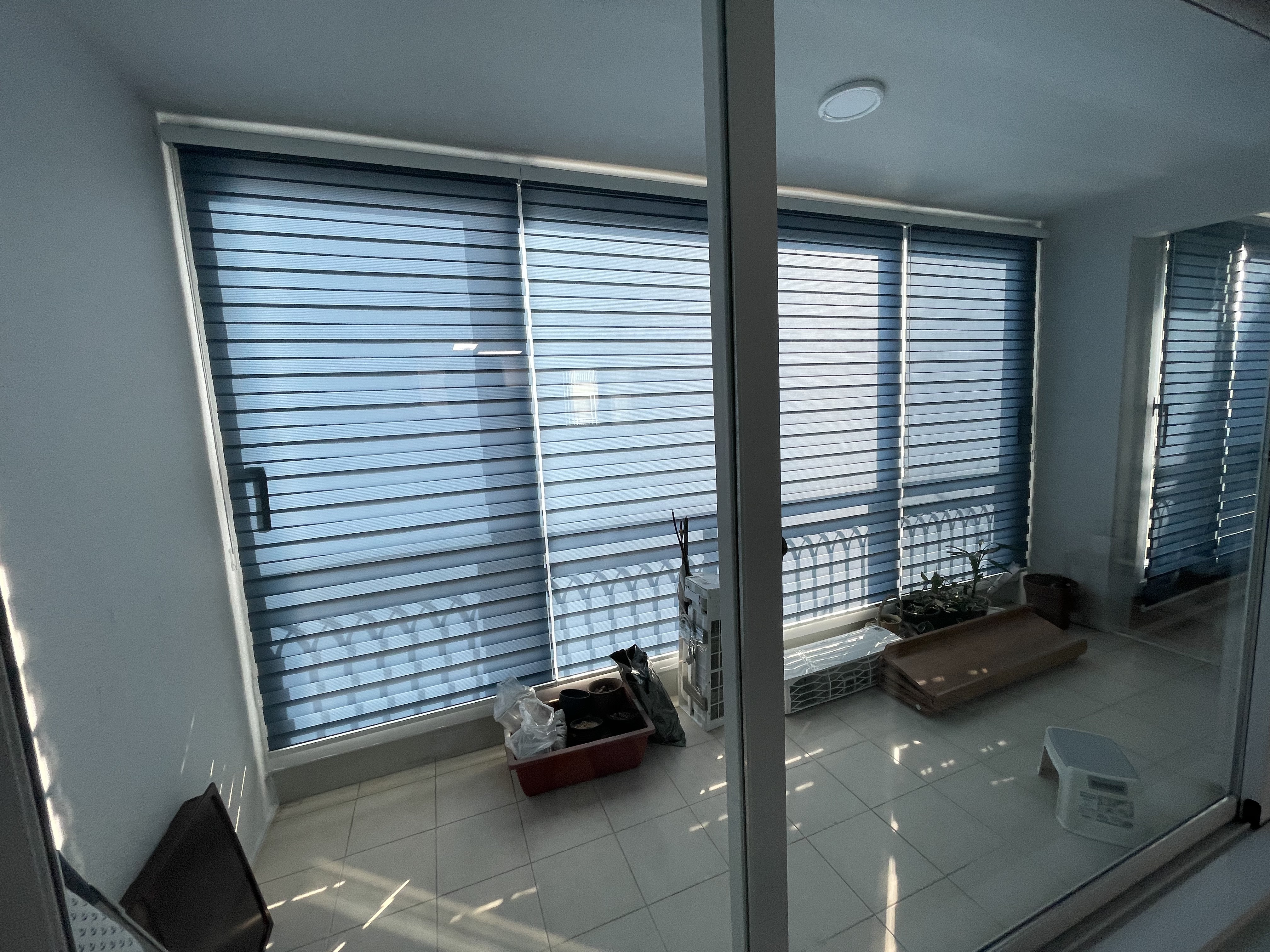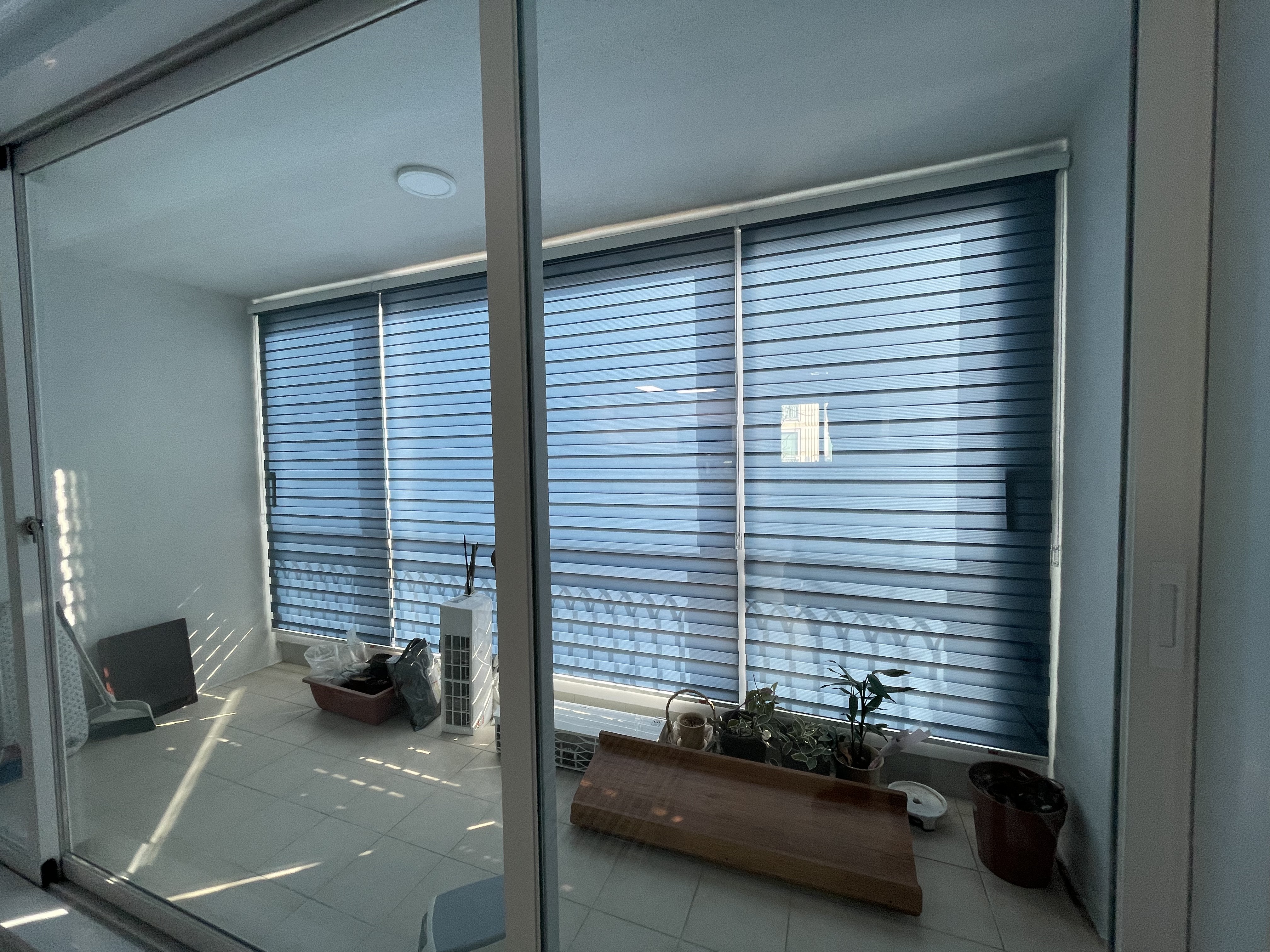 빨래를 하거나 짐을 보관하는 베란다와 세탁실은 자칫 지저분해 보일 수 있는 공간입니다. 이곳에는 안방보다 한 톤 짙은 '다크블루 콤비블라인드'를 설치하여 통일감을 주면서도 깔끔하게 정돈된 느낌을 연출했습니다.