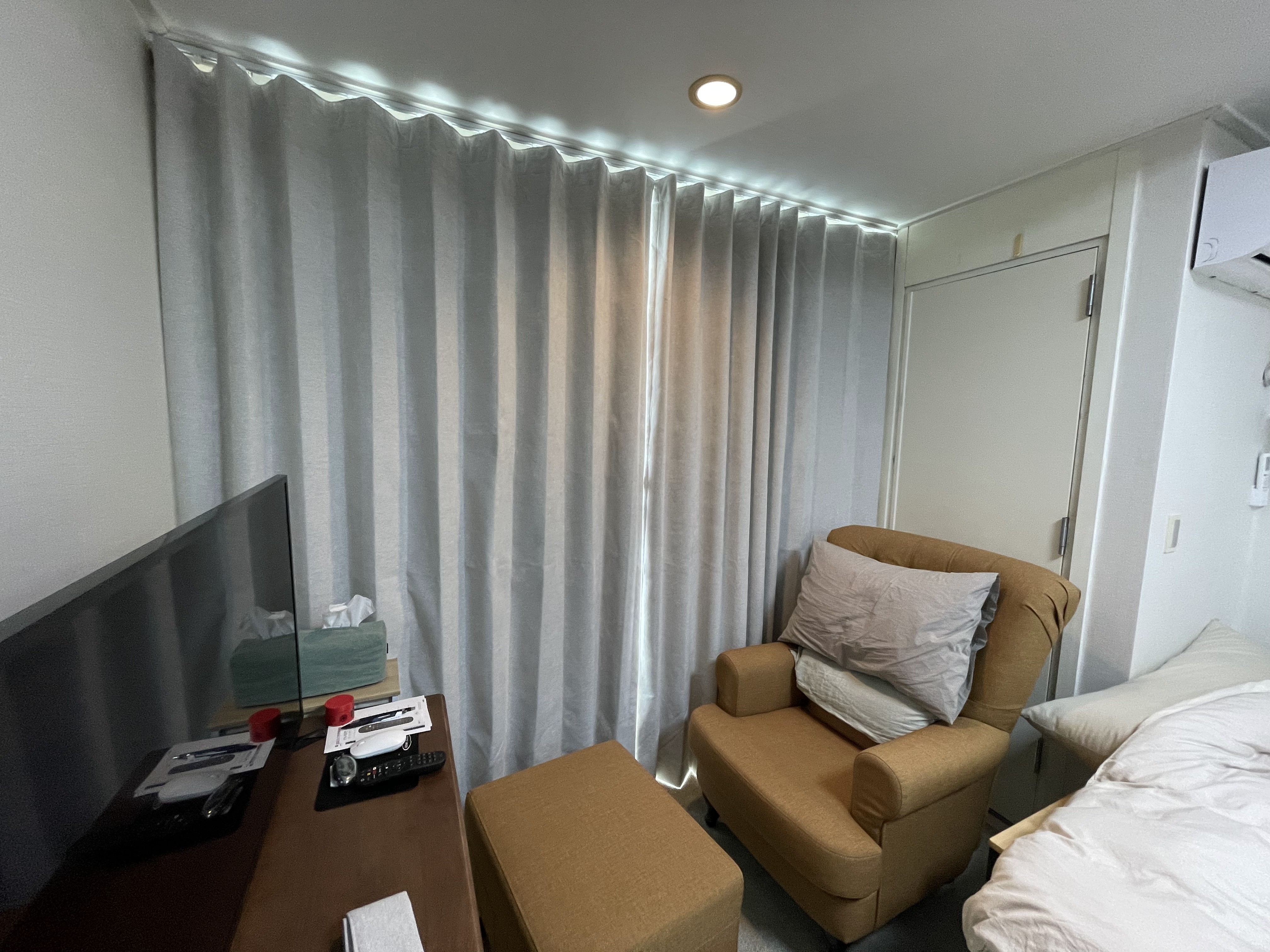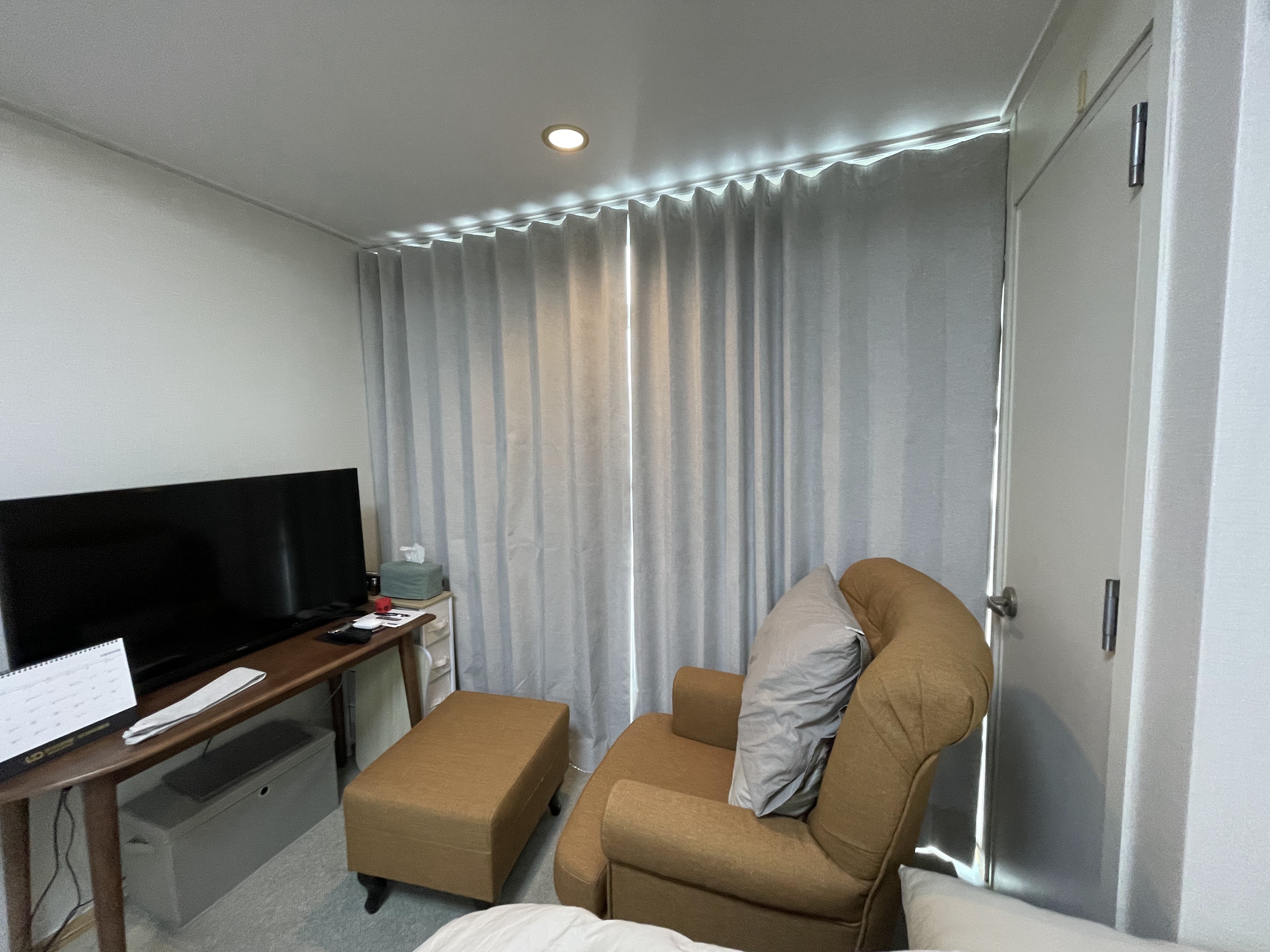 이번 현장의 핵심 키워드는 기능이 뛰어난 제품이었습니다. 오피스텔 구조상 창문이 넓어 여름철 햇빛 차단과 겨울철 우풍 차단이 중요한 과제였습니다. 이를 해결하기 위해 특수 가공된 100% 암막 원단과 방풍 기능을 갖춘 형상기억 커튼을 조합했습니다.