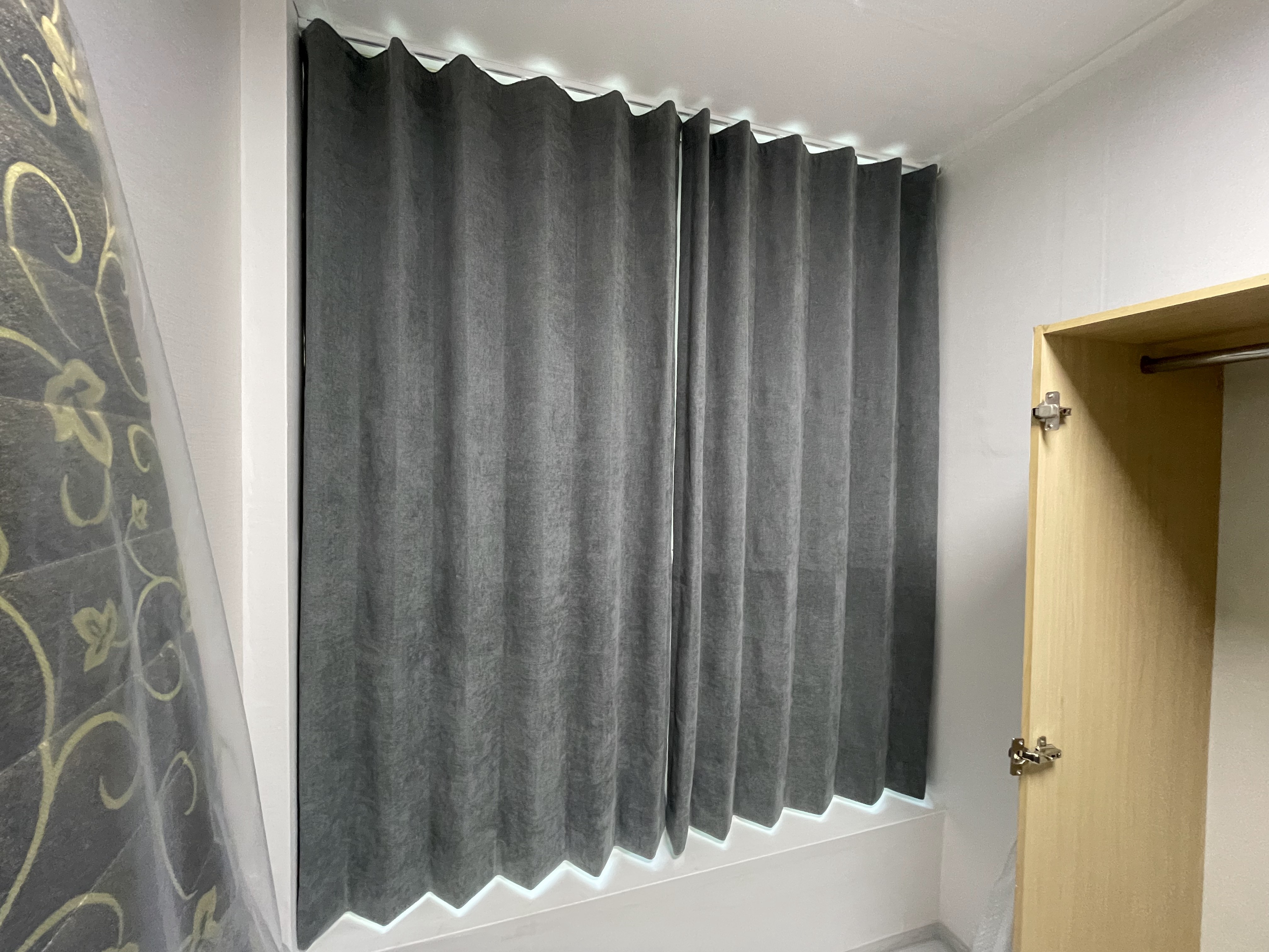 고시원처럼 협소한 공간은 옷가지나 짐들이 많아 자칫 지저분해 보일 수 있습니다. 따라서 커튼은 시선을 잡아주며 공간을 차분하게 눌러주는 색상이 좋습니다. 이번 현장에서는 '인테리어 디자인이 잘 어울리는' 다크그레이 컬러를 선택했습니다.